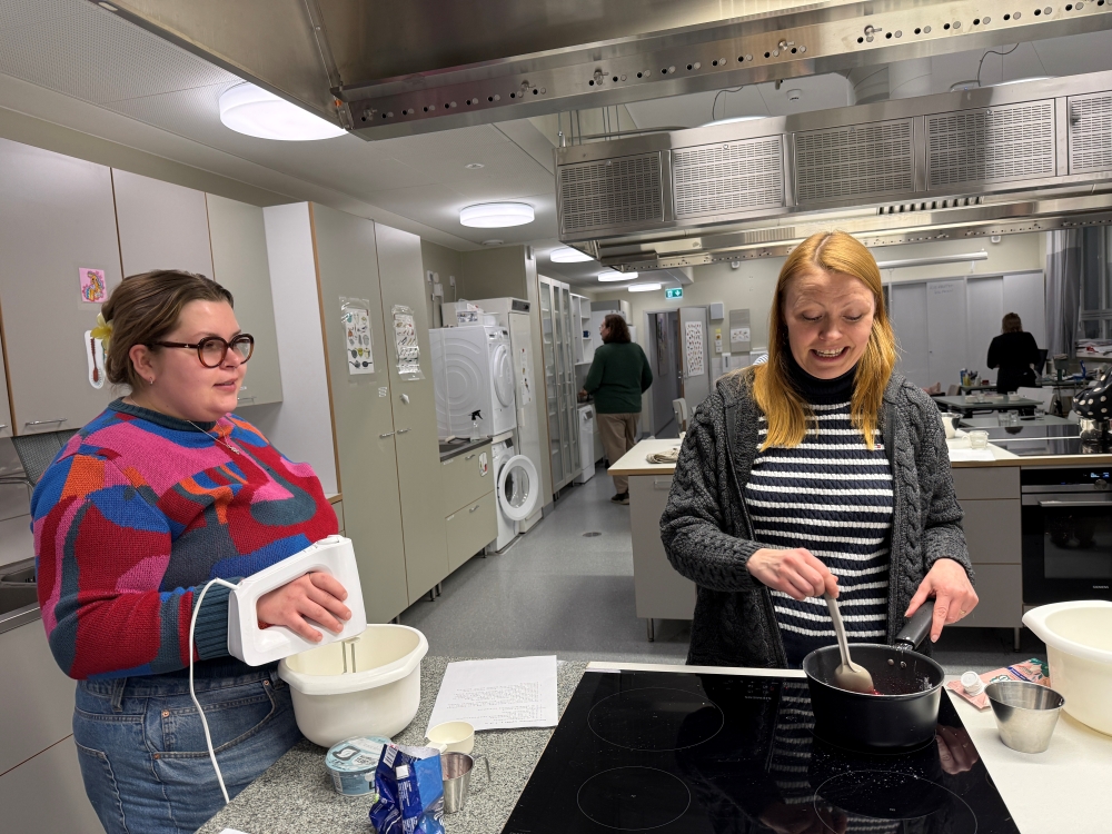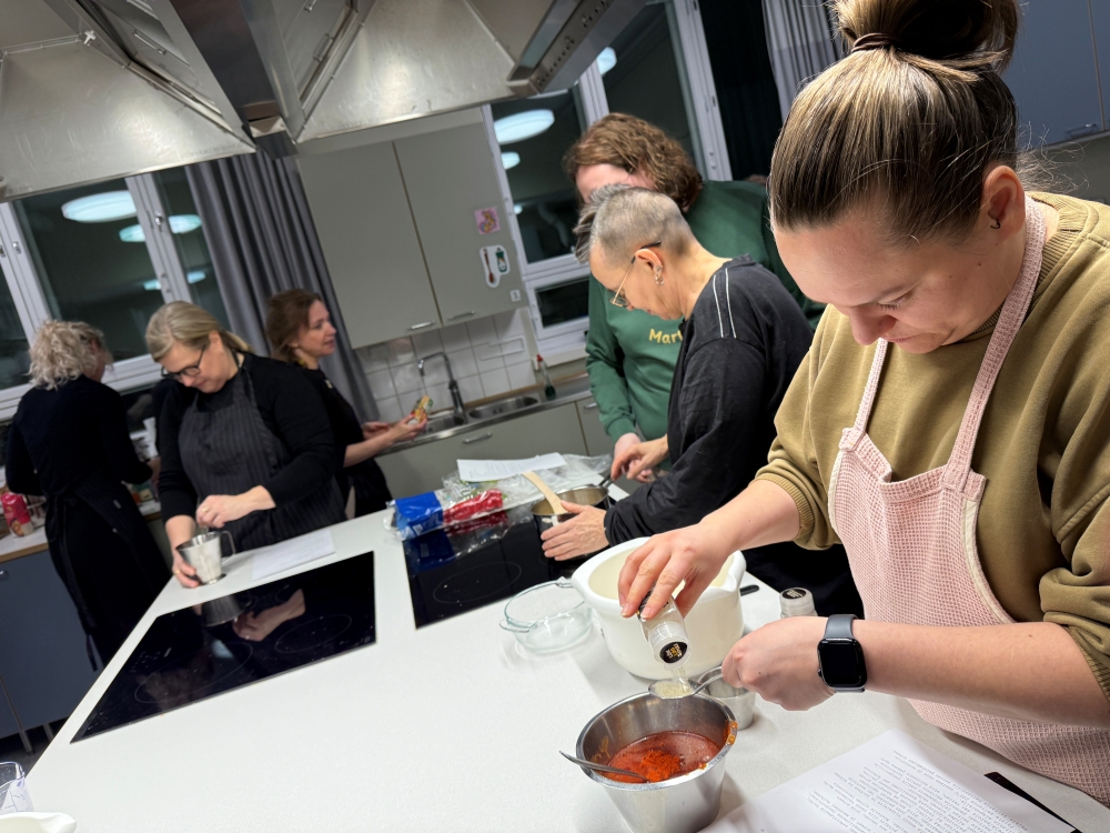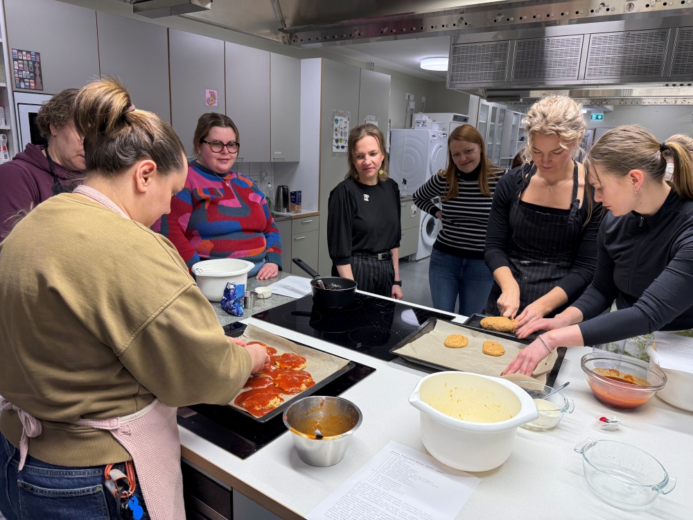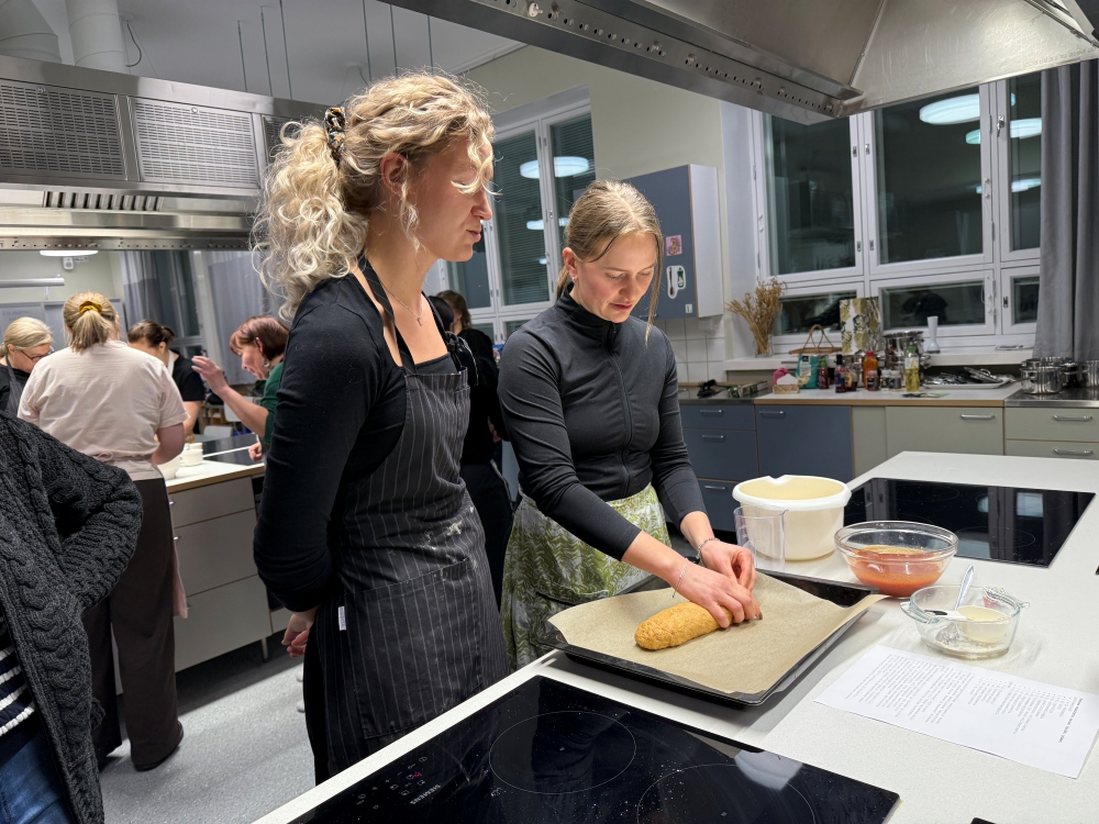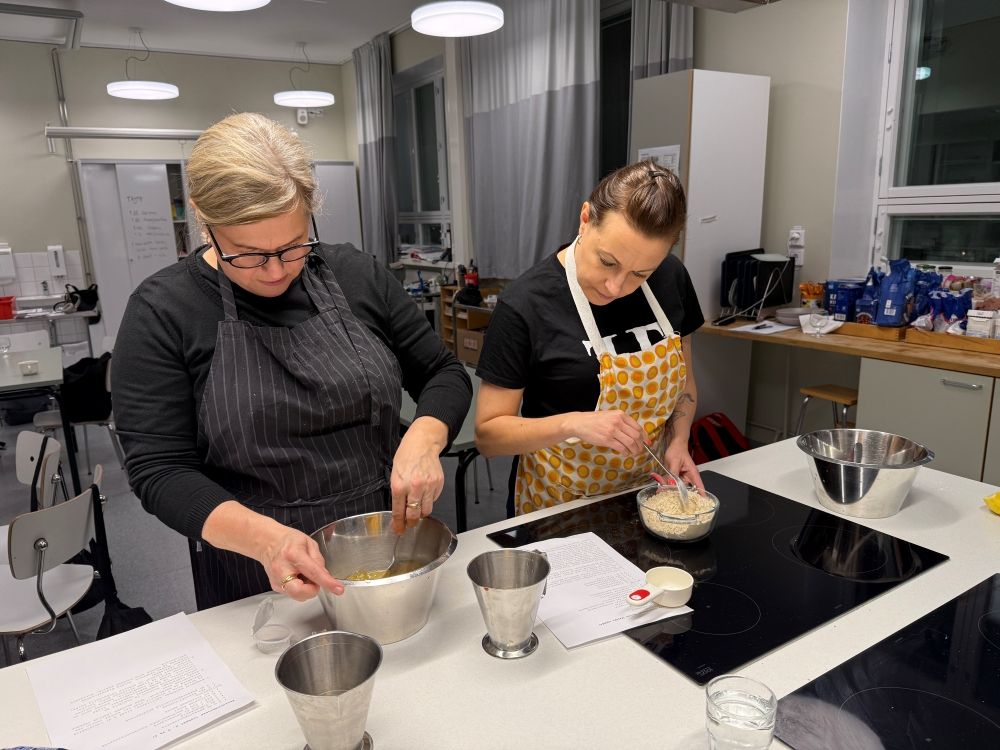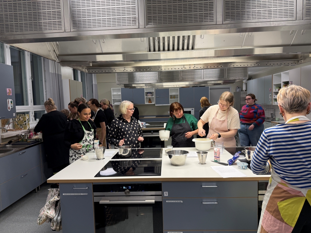 Helmikuisena tiistaina kipusimme kerros kerrokselta yhä ylemmäs Aleksis Kiven koulun kivisiä portaista. Määränpäänä häämötti ylimmän kerroksen kotitalous- eli köksänluokka, kuten moni meistä sitä yhä kutsuu. Olimme ensimmäistä kertaa varanneet tapahtumaamme ulkopuolisen tilan, jossa kaikki mahtuisivat kunnolla leipomaan ja kokkaamaan yhdessä. Ja kannattihan se! Paikalle saapui poikkeuksellisen runsas joukko innokkaita KUMilaisia.