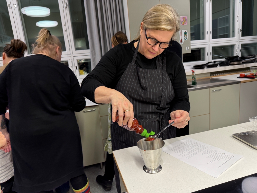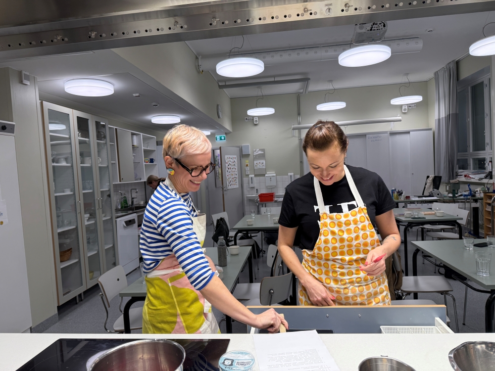 Tunnelma köksänluokassa oli lämmin ja vapautunut, kuten odottaa sopii. Itse tila toimi hyvin, ja hyvälaatuiset koneet ja välineet, kuten induktioliedet, tekivät kokemuksesta jopa odotettua paremman. Ehkä meillä mielessä oli oman lapsuuden koulujemme vähän nuhraantuneemmat tilat? Oli hauskaa kokoontua uuteen paikkaan, kokeilla jotain monelle uutta ja ennen kaikkea tehdä yhdessä. Kaikki pääsivät osallistumaan, oppimaan ja maistamaan.
