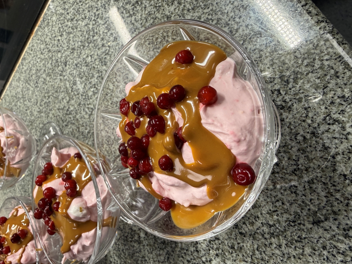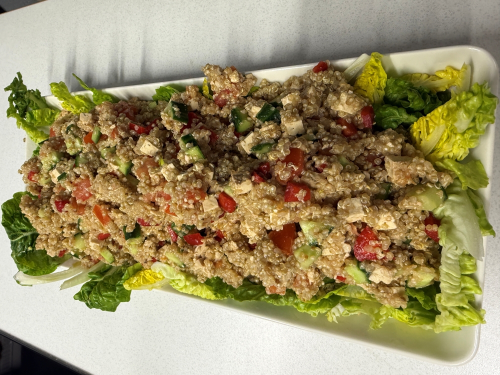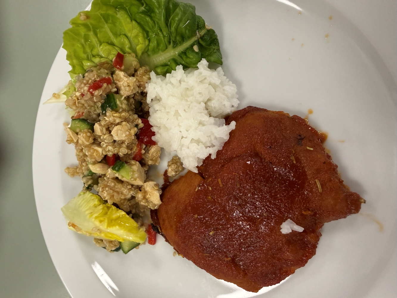 Parinkymmenen minuutin paistamisen jälkeen höyryävät pihvit siirtyivät uunista lautasille Valmiit pihvit nautimme riisin ja raikkaan kuskus-salaatin kera. Jälkiruoaksi herkuttelimme puolukkaisella jälkkärillä, joka sai kiitosta sekin. Puolukkamousse oli täysin vegaaninen, kuten koko illan menu, mutta sen voi halutessaan myös helposti toteuttaa ei-vegaanisena.